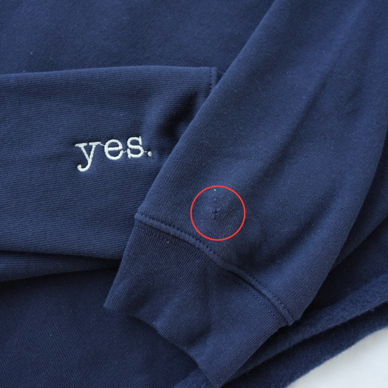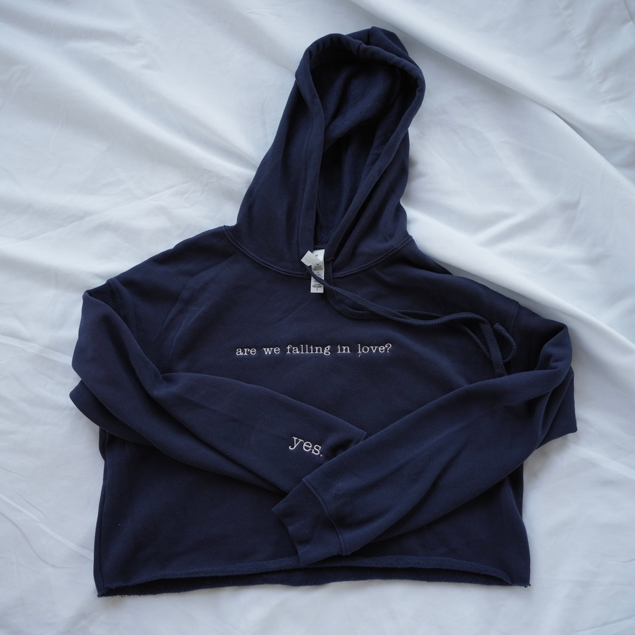 - Yes or No Cropped Women's Navy Hoodie (Size S) - Small hole on left wrist with no "no" stitched on