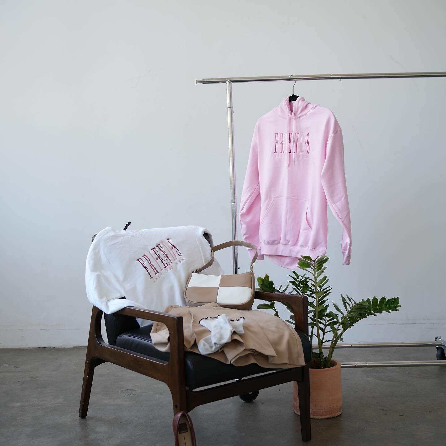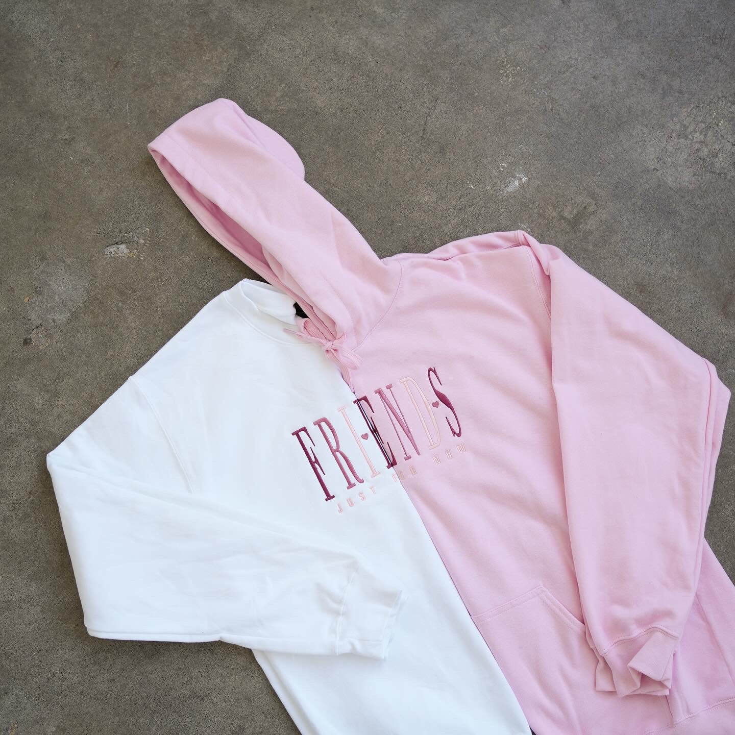 Bringing in a vintage feel with this embroidered design. Featuring several shades of pink to match V's FRI(END)S promo concept. FRIENDS is depicted on the front along with the words "Just For Now" underneath it.