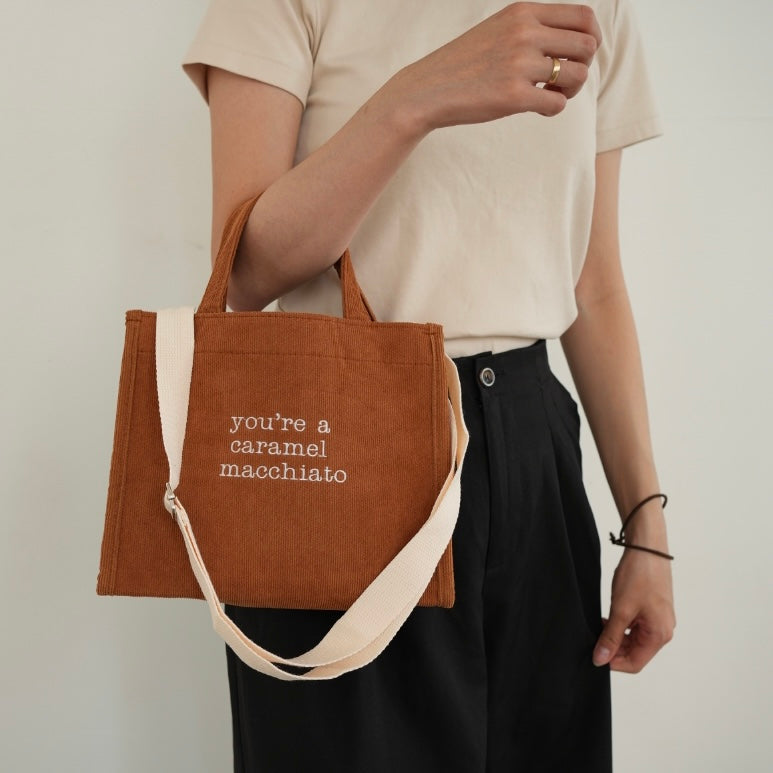 Design Location - Permanent vinyl of coffee flower symbol on front small pocket, embroidered words in white thread on back side